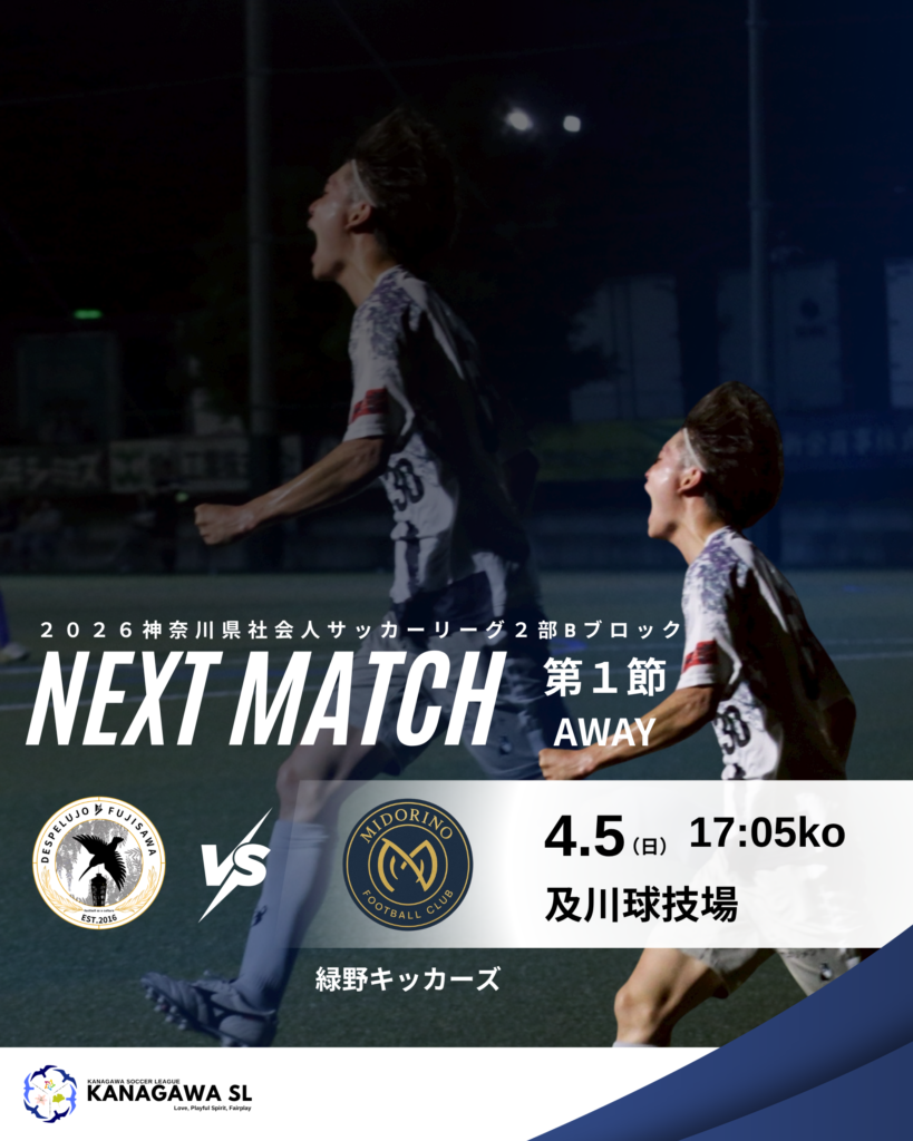5日(日)、及川球技場にて行われます『神奈川県社会人サッカーリーグ2部Bブロック第1節 vs 緑野キッカーズ』の試合情報をお知らせいたします。
